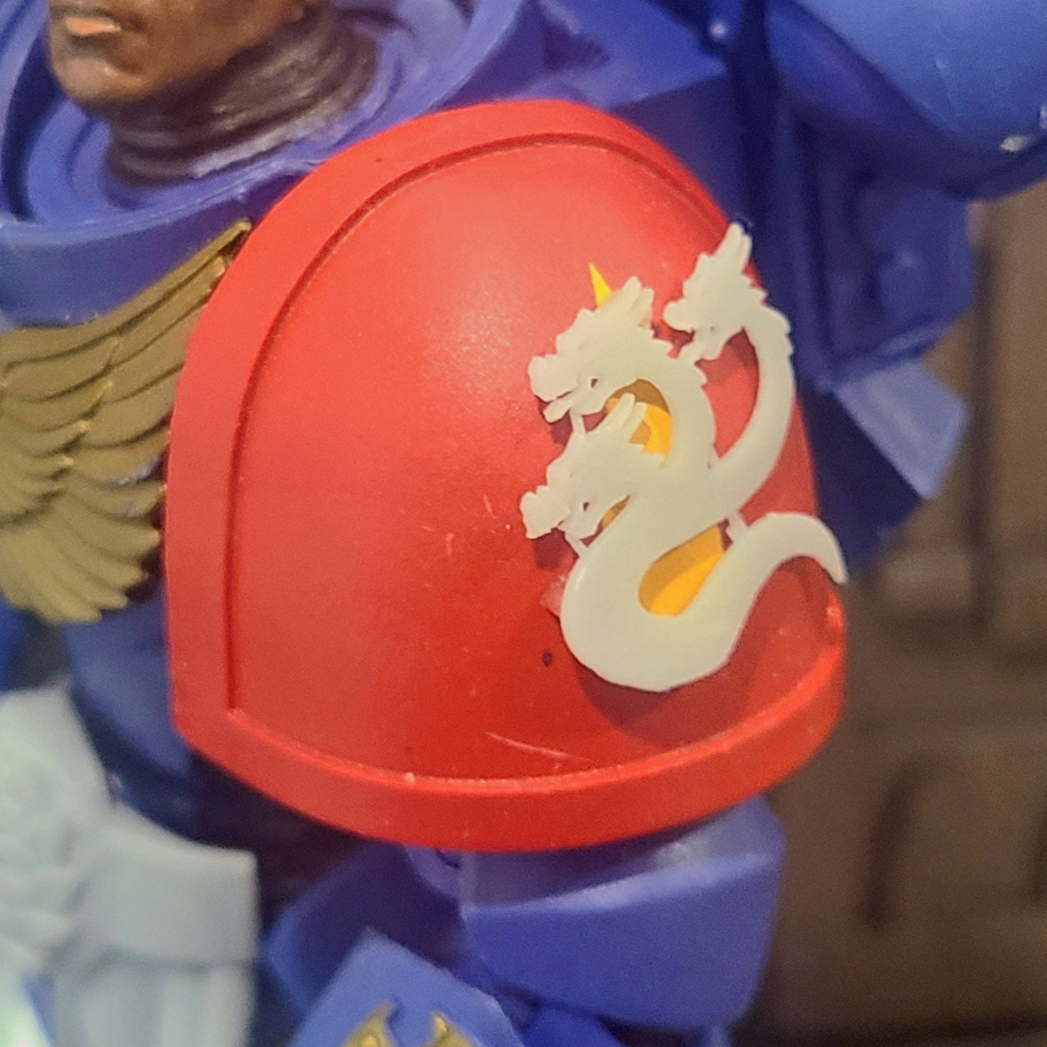 This resin replacement shoulder pad decal is not painted. Simply glue it to any of your models to provide a raised emblem that makes painting easy and ensures a consistent and uniform appearance for your JoyToy Space Marine* action figure (sold separately).